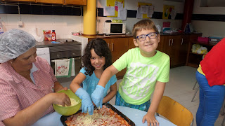 Com o apoio dos pais (ingredientes), as funcionárias e crianças do CATL confeccionaram pizza vegetariana para o almoço.